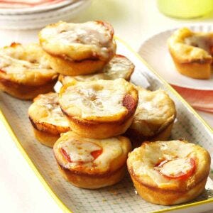 Flatten each biscuit into a 3-in. circle and press into a greased muffin cup. Combine the tomato sauce and Italian seasoning; spoon 1 teaspoonful into each cup. Top each with a slice of pepperoni and about 1 tablespoon of cheese.
