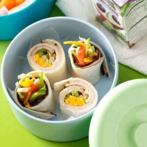 Place two slices of turkey on each tortilla. Layer with tomato, green pepper, lettuce and cheese. Drizzle with salad dressing. Roll up tightly.
