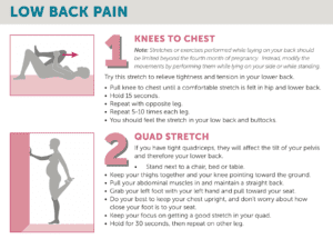 The hormonal changes that can affect your joints, as well as the additional weight being carried in pregnancy can lead to aches, pains or discomfort. These changes can affect other areas of the body including the pelvic area, hands, wrists, feet and the thoracic (mid- to-upper) spine as well. There are a number of simple stretches that can easily be performed at home and which can help provide relief from these painful or uncomfortable conditions.