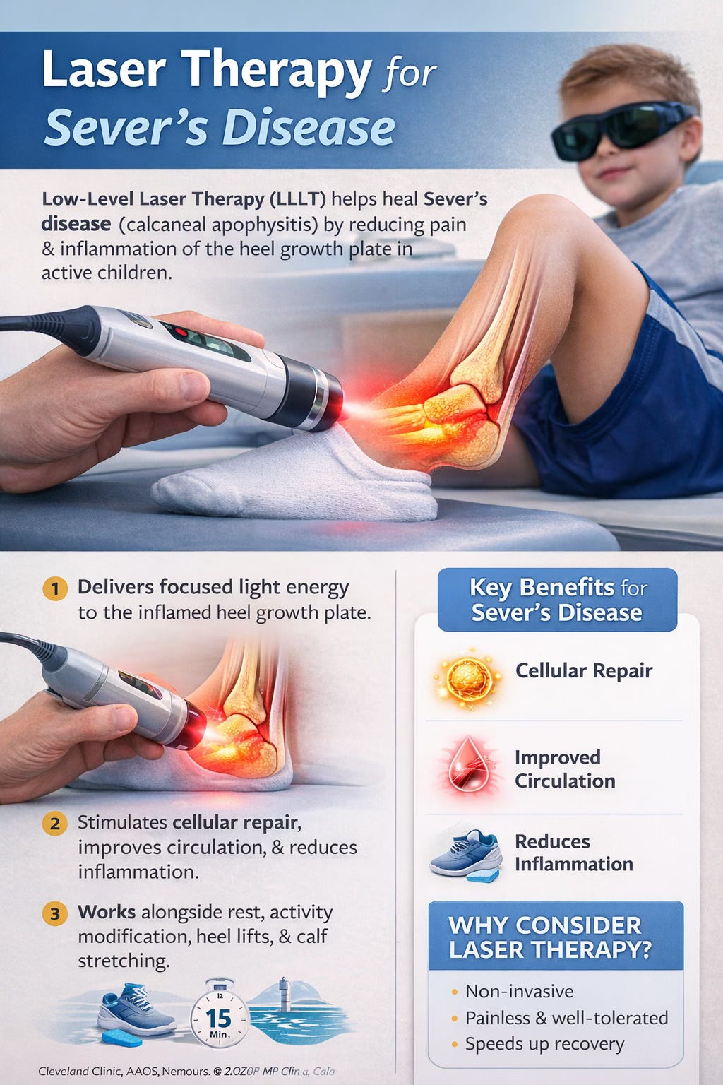 Laser therapy, particularly low-level laser therapy (LLLT) or photobiomodulation, can be a useful adjunct in managing Sever’s disease by helping reduce pain and inflammation at the heel growth plate without placing additional mechanical stress on the area. The treatment works by delivering light energy to the affected tissues, which may help stimulate cellular repair processes, improve circulation, and modulate inflammation. In clinical practice, many patients report a reduction in pain after a few sessions, allowing for a quicker return to comfortable movement and activity. Laser therapy is non-invasive, painless, and well-tolerated in children, making it a suitable option alongside primary treatments such as activity modification, calf stretching, and the use of heel lifts or supportive footwear. While it does not replace the need to address underlying biomechanical factors, it can help accelerate recovery and improve overall comfort during the healing process.
