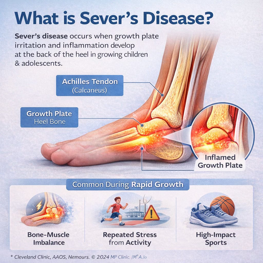 One of the most important things to understand is that Sever’s disease is closely tied to growth. During adolescence, the body does not always grow evenly. Bones may lengthen quickly while muscles and tendons lag behind. This creates tension through the Achilles tendon and places extra stress on the heel growth plate (Boston Children’s Hospital, 2026; Cleveland Clinic, 2025).