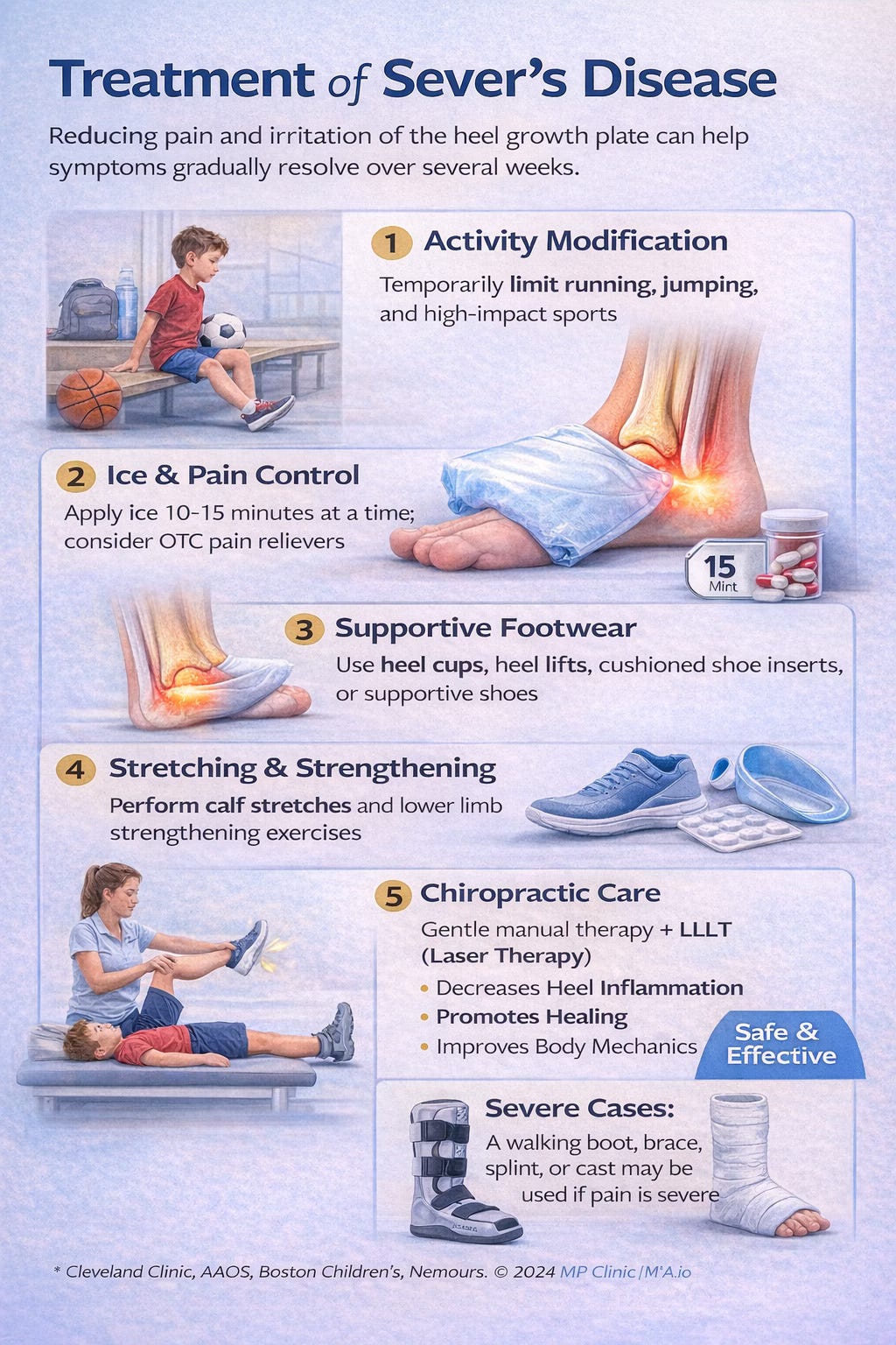In more severe cases, when pain is bad enough to affect walking, a provider may recommend a walking boot, brace, splint, or even a short period of casting to reduce motion and allow the heel to calm down (AAOS, 2026; Cleveland Clinic, 2025; Nemours KidsHealth, 2019).