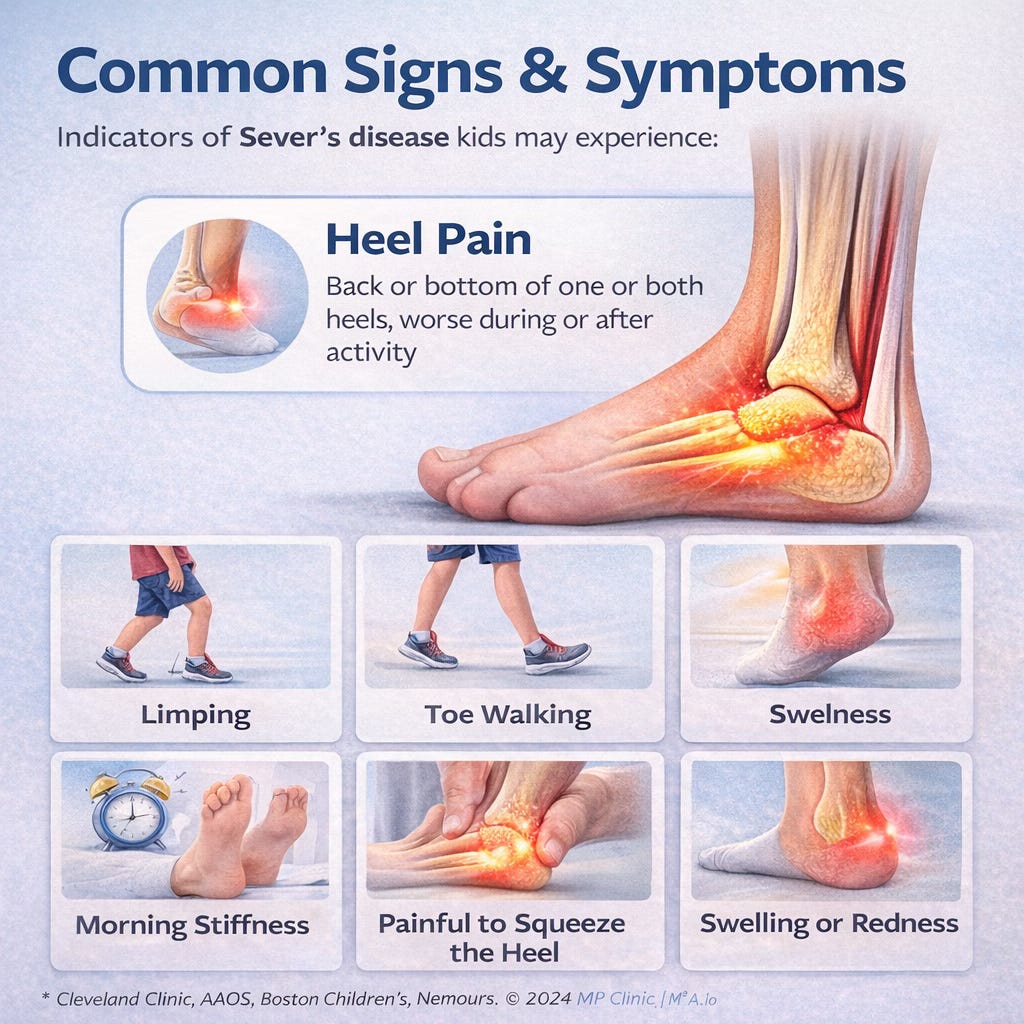 Other common features include limping, toe walking, stiffness first thing in the morning, swelling or redness around the heel, and pain when the heel is squeezed from the sides (Boston Children’s Hospital, 2026; Cleveland Clinic, 2025; Nemours KidsHealth, 2019). Some children may not describe it very clearly and instead just say they “don’t want to run” or that their heel “feels weird” after sports.