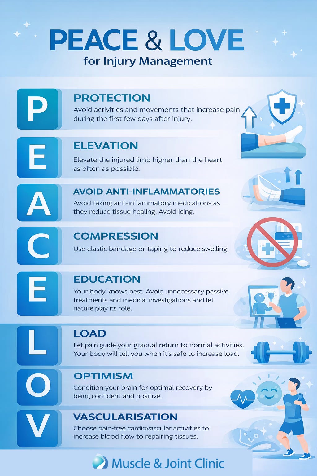 Traditional injury management followed the R.I.C.E. principle: rest, ice, compression, and elevation. While still useful in certain situations, modern rehabilitation has evolved toward the PEACE & LOVE framework, which promotes a more balanced and active recovery strategy. PEACE focuses on early protection and education, while LOVE emphasizes the importance of gradual loading, optimism, vascularization, and exercise. This model encourages “relative rest,” meaning patients avoid aggravating activities but continue to engage in safe, modified movement. Evidence supports this approach, showing that progressive loading and exercise-based rehabilitation improve outcomes in both acute and chronic conditions, including osteoarthritis (Bennell et al., 2016; Messier et al., 2013).