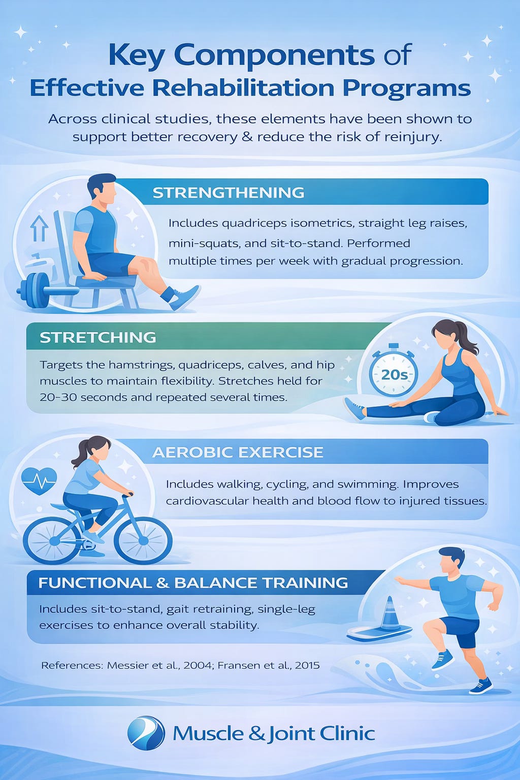 In addition to strengthening and flexibility, aerobic exercise plays a key role in recovery. Low-impact activities such as walking, cycling, and swimming help improve cardiovascular health while enhancing blood flow to injured tissues. Research shows that combining aerobic exercise with strengthening leads to better long-term outcomes compared to isolated interventions (Messier et al., 2004; Fransen et al., 2015). Many programs also incorporate functional and balance training, including sit-to-stand movements, gait retraining, and single-leg stability exercises. These components help patients return to daily activities safely and reduce the risk of reinjury.
