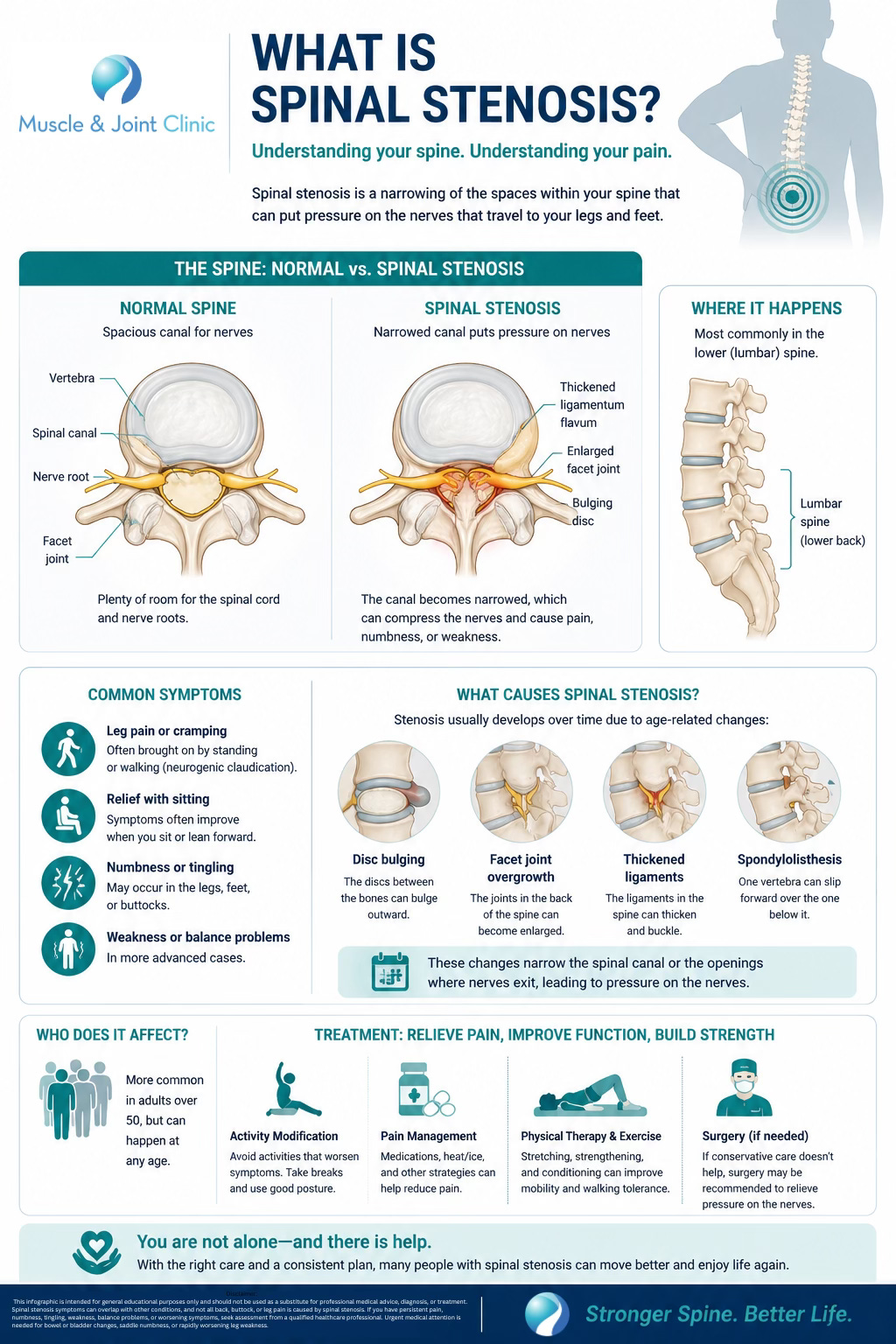 At the Muscle and Joint Clinic, one of the most important parts of care is helping patients understand what spinal stenosis actually is, why it causes the symptoms it does, and what evidence-based treatment can realistically achieve. For many people, the biggest goals are simple and meaningful: walk farther, stand longer, sleep better, move with less fear, and avoid the cycle of pain and inactivity that can slowly shrink daily life. Those goals matter, and research suggests they are often worth working toward with a structured, individualized rehabilitation approach before moving to more invasive options (Schneider et al., 2019; Iversen et al., 2010).
