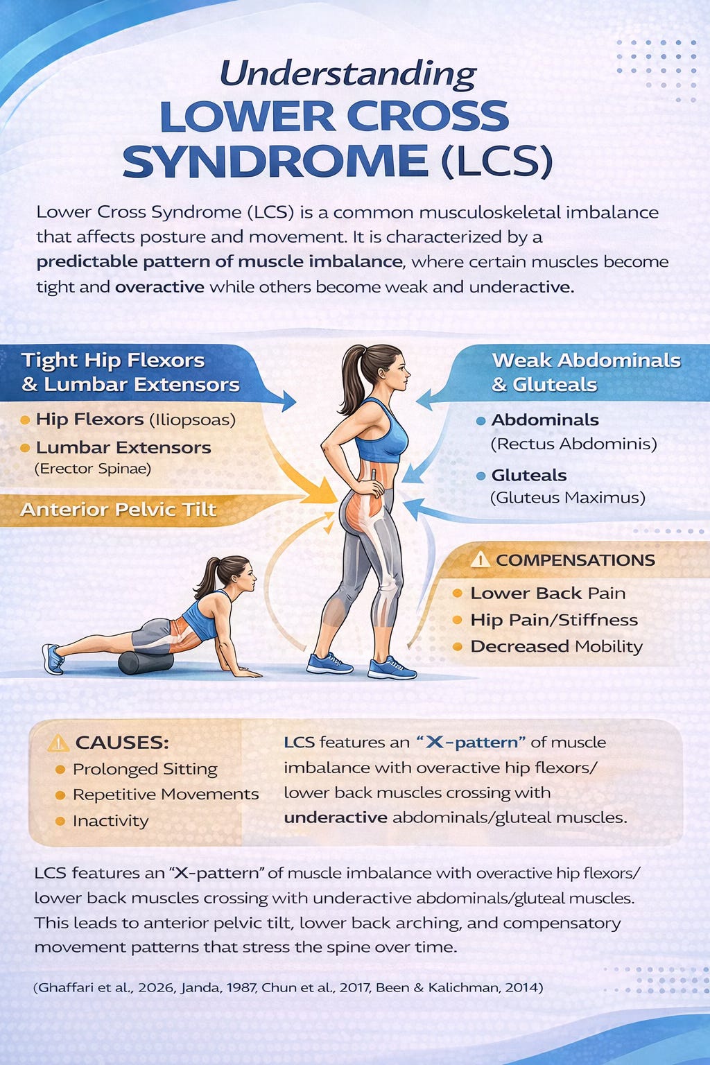 Lower Cross Syndrome (LCS) is a common but often overlooked musculoskeletal condition that affects posture, movement, and overall function. It is characterized by a predictable pattern of muscle imbalance, where certain muscles become tight and overactive while others become weak and inhibited. This imbalance typically develops due to prolonged sitting, repetitive movements, or inactivity, all of which are increasingly common in modern lifestyles (Ghaffari et al., 2026; Janda, 1987). Over time, these patterns can lead to postural changes such as anterior pelvic tilt and increased curvature of the lower back, known as lumbar hyperlordosis.
