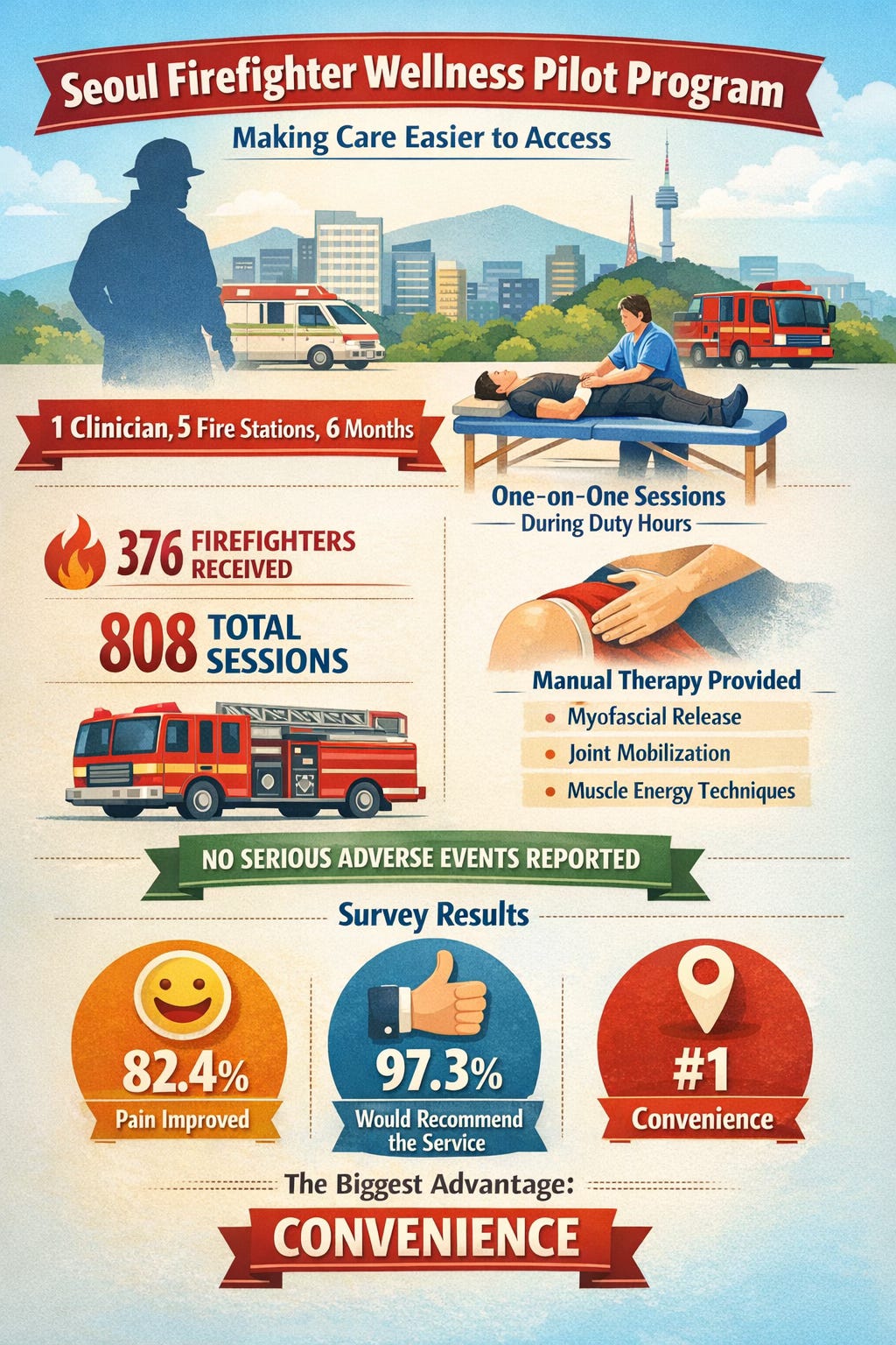 The idea was simple: make care easier to access. In the Seoul pilot program, one clinician rotated through five fire stations over six months and provided one-on-one sessions during duty hours. In total, 376 firefighters received 808 sessions. Most visits included manual therapy techniques such as myofascial release, joint mobilization, and muscle energy techniques, and no serious adverse events were reported. Among survey respondents, 82.4% said their pain scores improved, 97.3% said they would recommend the service, and the biggest advantage they reported was convenience.