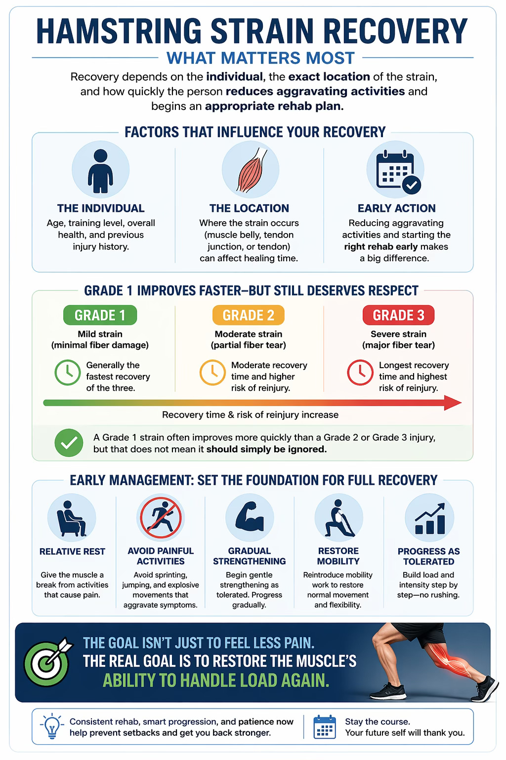Recovery depends on the individual, the exact location of the strain, and how quickly the person reduces aggravating activities and begins an appropriate rehab plan. In general, a Grade 1 hamstring strain often improves more quickly than a Grade 2 or Grade 3 injury, but that does not mean it should simply be ignored. Early management often includes relative rest, avoiding painful sprinting or explosive movement, and gradually reintroducing strengthening and mobility work as tolerated. The goal is not just to feel less pain. The real goal is to restore the muscle’s ability to handle load again.