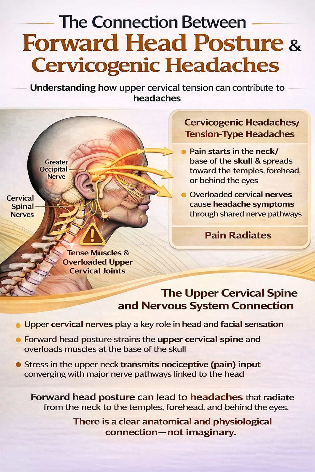 There is also a nervous system component. The upper cervical spine shares close relationships with nerves that contribute to head and facial sensation. When muscles at the base of the skull are constantly tense and upper cervical joints are overloaded, this can contribute to cervicogenic headaches and tension-type headache patterns. The pain does not arise because the brain itself is injured, but because nociceptive input from the upper neck converges with sensory pathways associated with the head. This is why people with forward head posture may report headaches that begin in the neck or base of the skull and spread toward the temples, forehead, or behind the eyes. The connection is anatomical and physiological, not imaginary. In many cases, the headache is one of the most important clues that the neck is under too much strain.