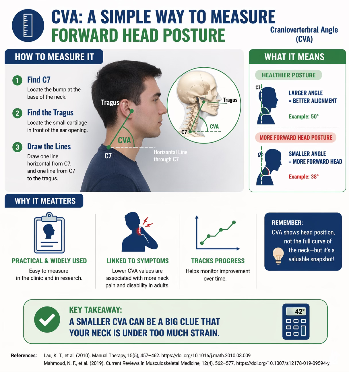 Clinically, one of the most common ways to measure forward head posture is by using the craniovertebral angle, or CVA. This angle is typically formed between a horizontal line through the seventh cervical vertebra and a line connecting that point to the tragus of the ear. A smaller angle generally indicates a more pronounced forward head posture. Although it does not provide a full picture of cervical curvature on its own, it is a practical and widely used measure in both research and clinical settings. Lower CVA values have repeatedly been associated with greater neck pain and disability in adults, making it a useful tool for tracking change over time (Lau et al., 2010; Mahmoud et al., 2019).