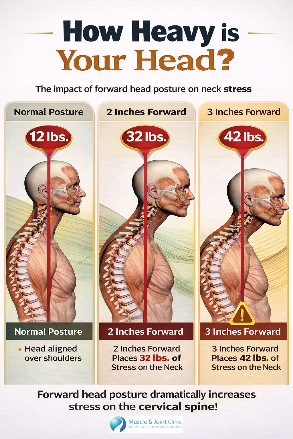One of the easiest ways to understand this is to think about leverage. The human head weighs roughly 10 to 12 pounds when it is centered over the shoulders. But when it moves forward, even by a small amount, the muscles and joints of the neck have to work much harder to support it. This is because the farther the head moves from the body’s center of gravity, the larger the bending moment becomes. Hansraj (2014) popularized this concept by showing that as the head tilts or moves forward, the effective load seen by the cervical spine rises dramatically. Even if the exact number varies from person to person, the principle is clear: the farther forward the head goes, the greater the stress placed on the neck.