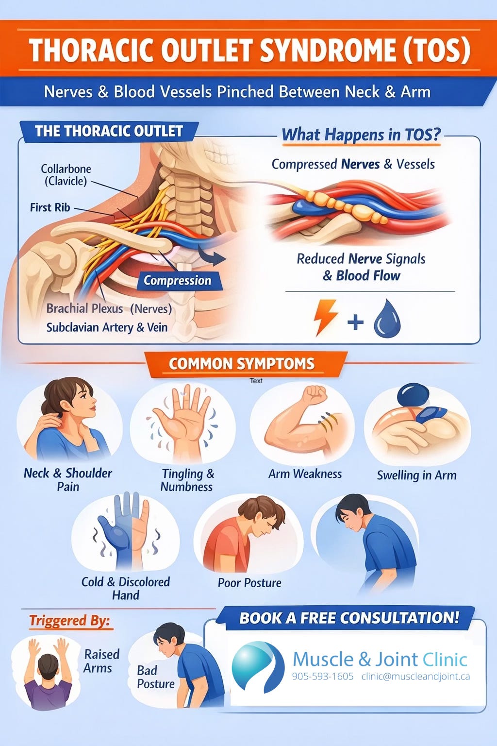 Thoracic Outlet Syndrome (TOS) is a condition in which important nerves and blood vessels become compressed, or “pinched,” as they travel from the neck into the arm through a narrow space between the collarbone and first rib. This space, known as the thoracic outlet, is surrounded by muscles, bones, and connective tissue, making it particularly vulnerable to narrowing or irritation. When compression occurs, it can interfere with normal nerve signaling and blood flow, leading to a range of symptoms. People with TOS commonly report neck and shoulder pain, tingling or numbness in the arm or hand, weakness, and in some cases changes in circulation such as swelling, discoloration, or a cold sensation in the affected limb (Li et al., 2021). These symptoms often worsen with certain positions or activities, particularly when the arms are raised overhead or when poor posture is maintained for extended periods.