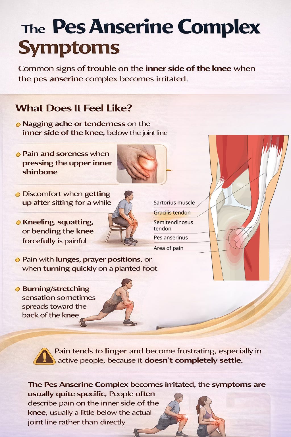 When the pes anserine complex becomes irritated, the symptoms are usually quite specific. People often describe pain on the inner side of the knee, usually a little below the actual joint line rather than directly in the center of the knee. The discomfort may feel like a nagging ache, a tender soreness, or sometimes a burning or pulling sensation. Many people notice it most when getting up after sitting for a while, kneeling down, squatting, or trying to bend the knee forcefully. Some feel pain during prayer positions, lunges, or when turning quickly on a planted foot. Others notice that the inside of the knee feels sore to touch, especially when pressing the upper inner shin. In some cases, the pain can spread slightly toward the back of the knee, especially if the semitendinosus portion of the complex is involved. A person may still be able to walk and function, but the discomfort tends to linger and become annoying because it does not completely settle.