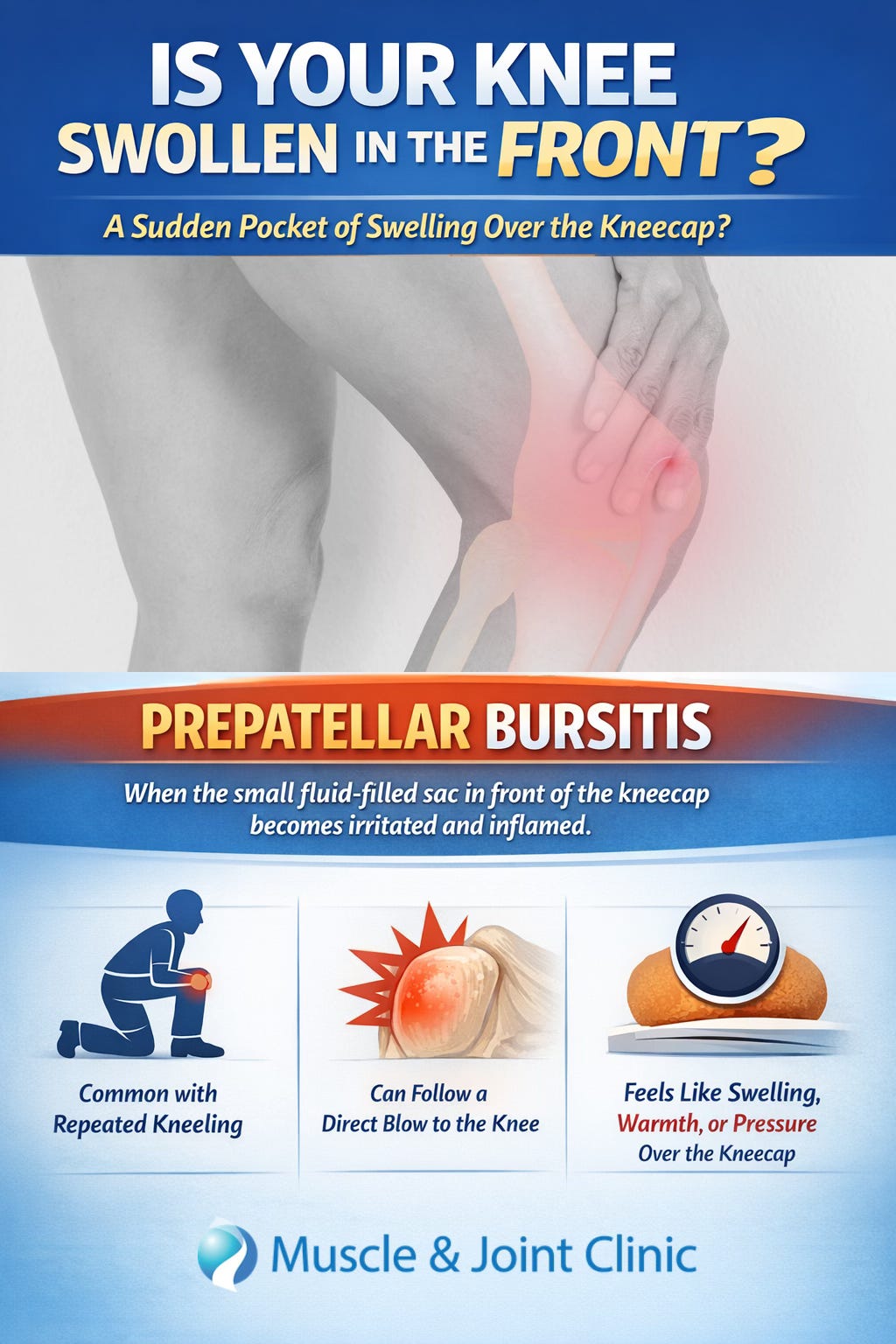 If you have ever noticed a sudden pocket of swelling at the front of your knee, especially right over the kneecap, one possible cause is prepatellar bursitis. This condition happens when the small fluid-filled sac in front of the kneecap, called the prepatellar bursa, becomes irritated and inflamed. The bursa normally helps reduce friction between the skin and the kneecap, but when it is aggravated, it can fill with extra fluid and become swollen, warm, and uncomfortable. In some cases, the area may feel more like pressure or tightness than sharp pain.