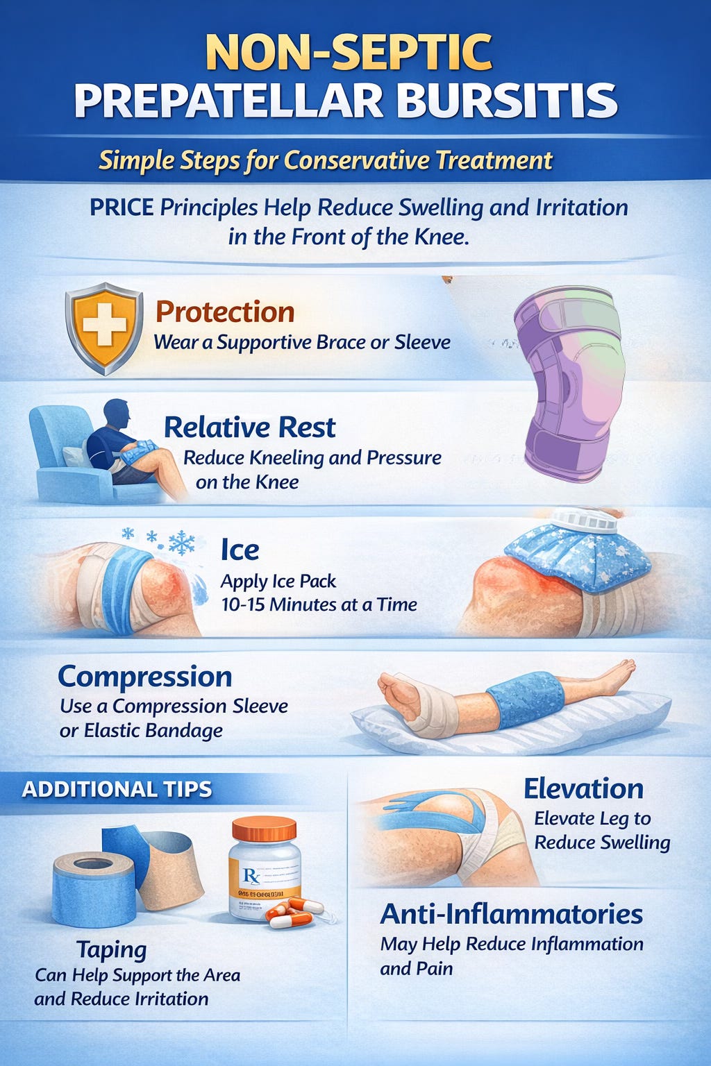 For non-septic prepatellar bursitis, conservative treatment is usually the best place to start. This often includes PRICE principles: protection, relative rest, ice, compression, and elevation. Reducing kneeling and avoiding repeated pressure on the front of the knee can make a big difference. Bracing or a compression sleeve may help control swelling and improve comfort with walking and daily activities. Taping can also be useful in some cases as a way to support the area and reduce local irritation. Anti-inflammatory medication may be considered when appropriate, depending on the patient’s health history and medical guidance (Aaron et al., 2011; Khodaee, 2017).