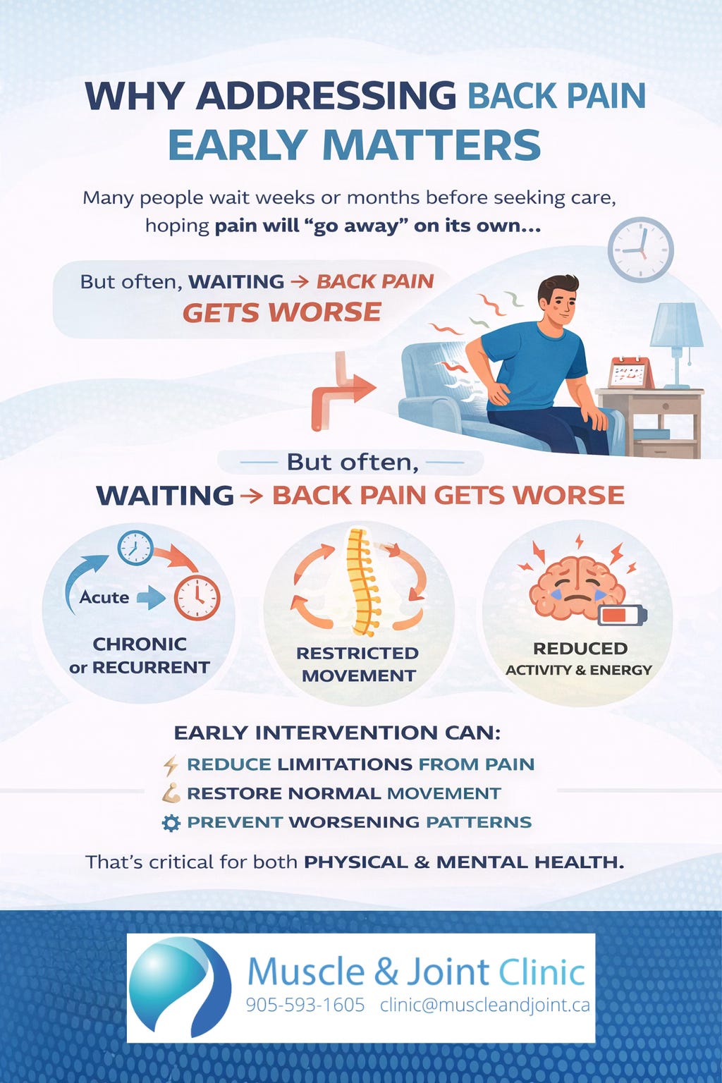 For the average person, this has very real implications. Many individuals wait weeks or even months before seeking care, often hoping the pain will resolve on its own. While some cases do improve spontaneously, others evolve into chronic or recurrent conditions that are significantly more difficult to manage. Early intervention helps break this cycle by reducing pain-related limitations, restoring normal movement, and preventing compensatory patterns from developing. It also helps maintain activity levels, which is critical for both physical and mental health.